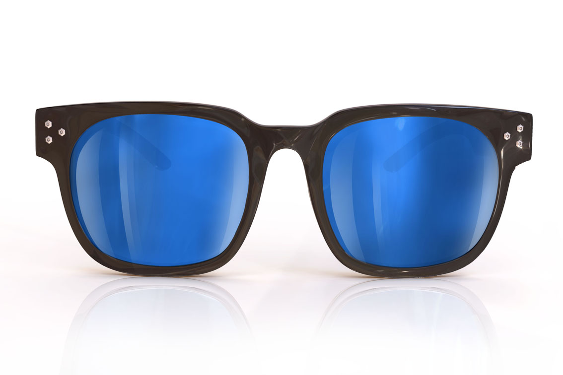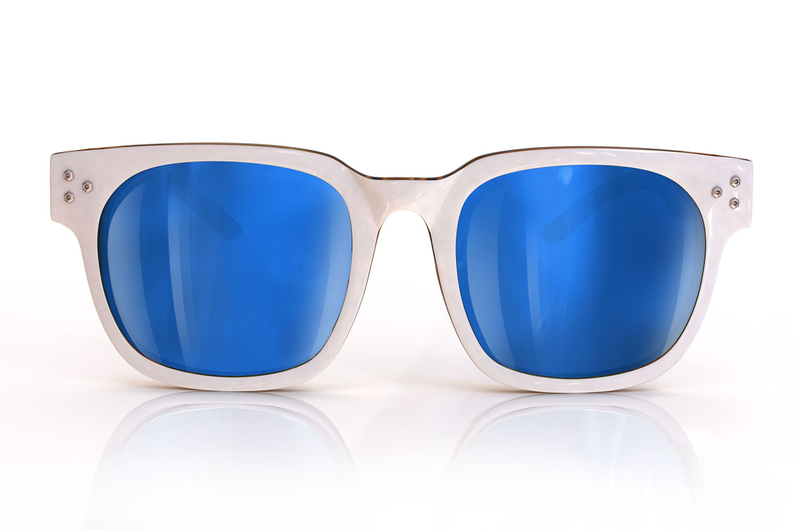 Очки из ацетата выпускаются в черном и белом цветовых решениях, с синими линзами. Большую роль играют детали: обратите внимание на солидный логотип в виде вратарского шлема на заушниках и заклепки на фронтальной части оправы.